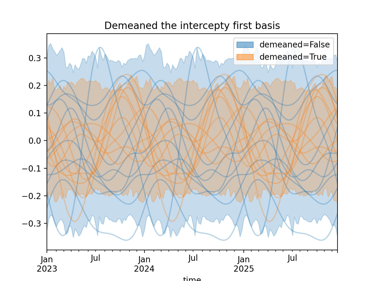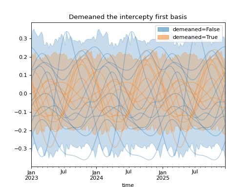 import numpy as np import pandas as pd import xarray as xr import matplotlib.pyplot as plt from pymc_marketing.mmm import HSGPPeriodic from pymc_marketing.plot import plot_curve seed = sum(map(ord, "Periodic GP")) rng = np.random.default_rng(seed) scale = 0.25 ls = 1 kwargs = dict(ls=ls, scale=scale, period=52, cov_func="periodic", dims="time", m=20) n = 52 * 3 dates = pd.date_range("2023-01-01", periods=n, freq="W-MON") X = np.arange(n) coords = {"time": dates} hsgp = HSGPPeriodic(demeaned_basis=False, **kwargs).register_data(X) hsgp_demeaned = HSGPPeriodic(demeaned_basis=True, **kwargs).register_data(X) def sample_curve(hsgp): return hsgp.sample_prior(coords=coords, random_seed=rng)["f"] non_demeaned = sample_curve(hsgp).rename("False") demeaned = sample_curve(hsgp_demeaned).rename("True") combined = xr.merge([non_demeaned, demeaned]).to_array("demeaned") _, axes = combined.pipe(plot_curve, "time", same_axes=True) axes[0].set(title="Demeaned the intercepty first basis") plt.show()
