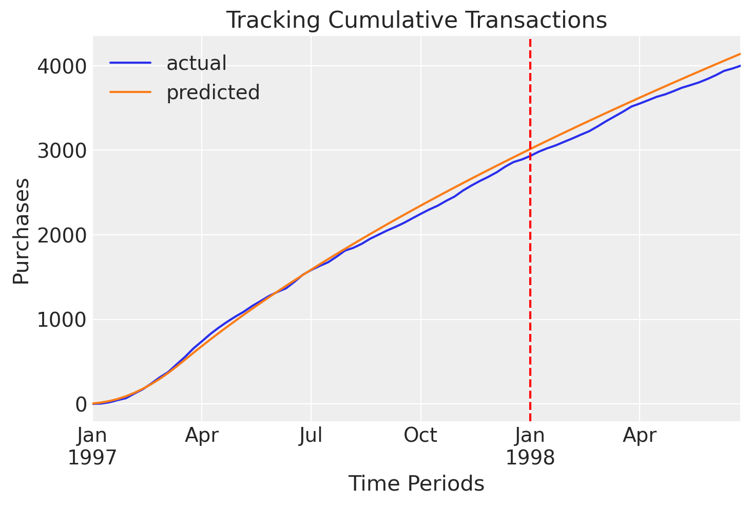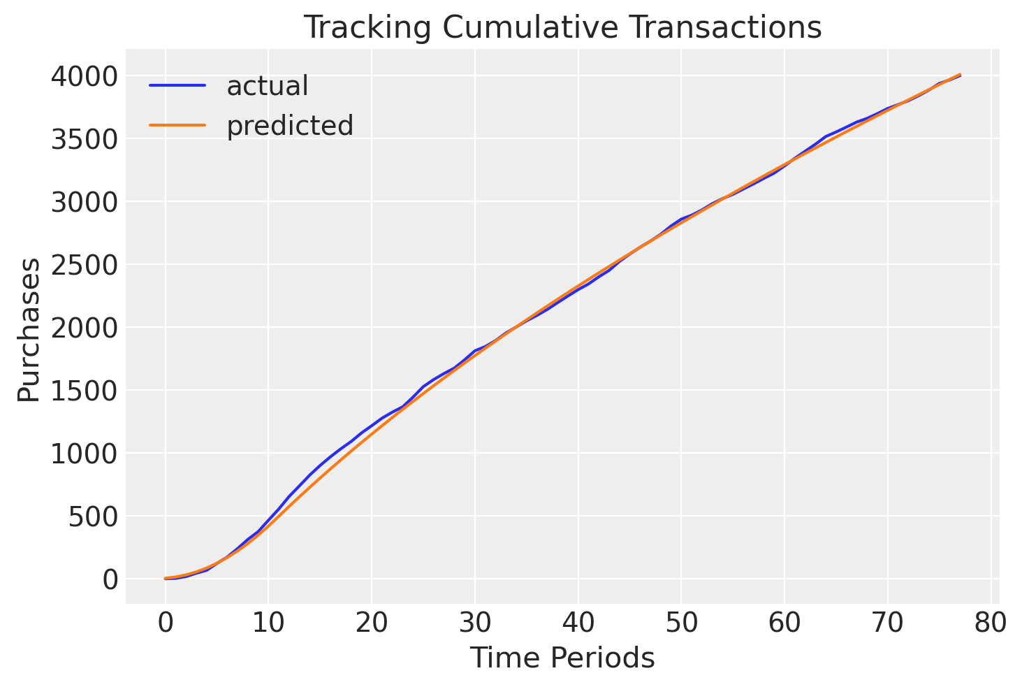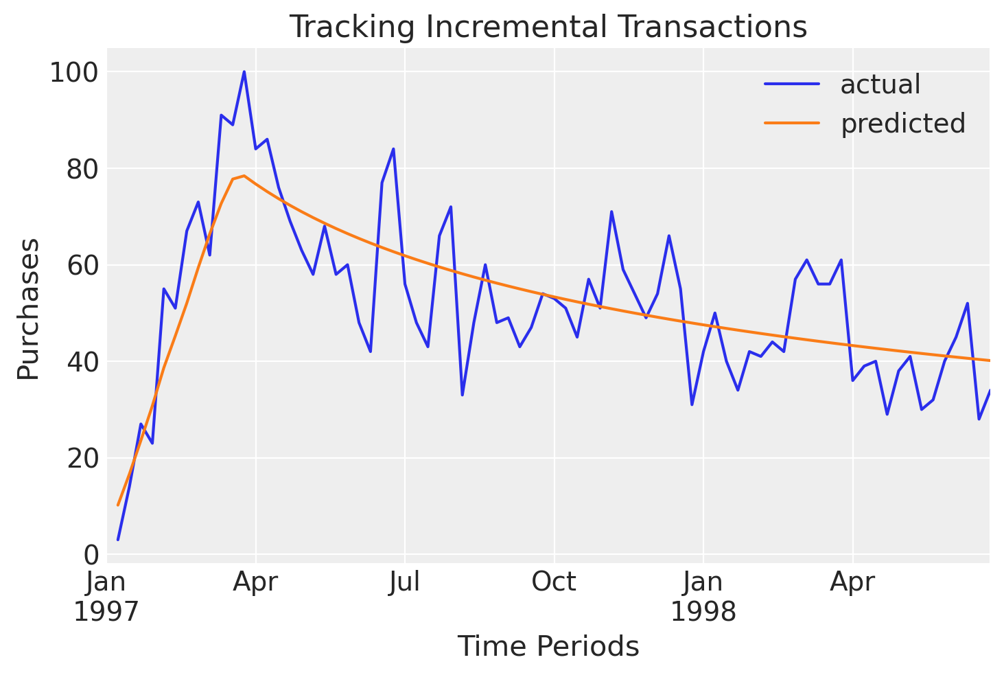 This dataset is an example of continuous time, noncontractual transactions because it comprises purchases from an online music store. PyMC-Marketing provides several models for this use case: