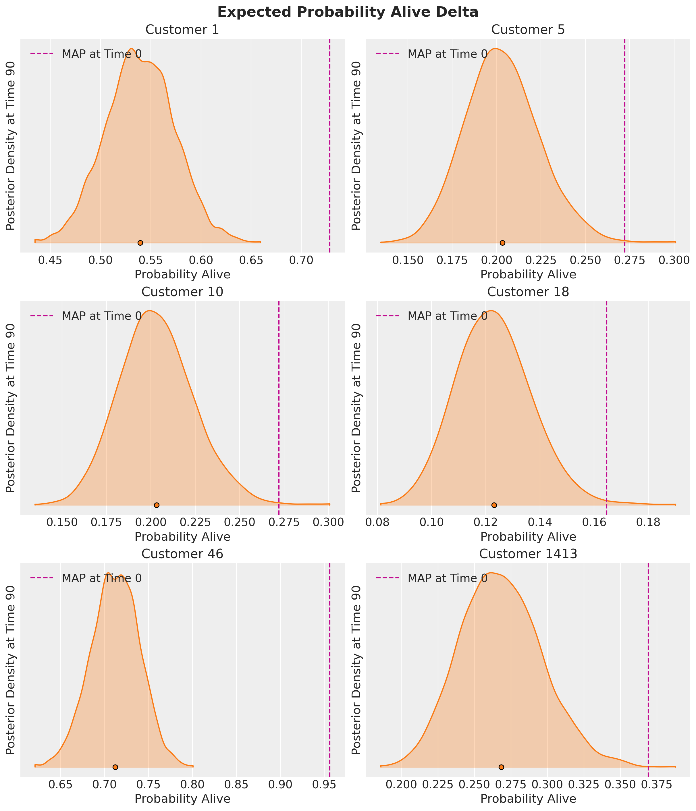 In this notebook we will use Bayesian inference to fit a Pareto/NBD model in PyMC-Marketing, and compare results with the frequentist lifetimes library (no longer maintained). We will also demonstrate the predictive functionality of this model, along with an example for time-invariant covariates.
