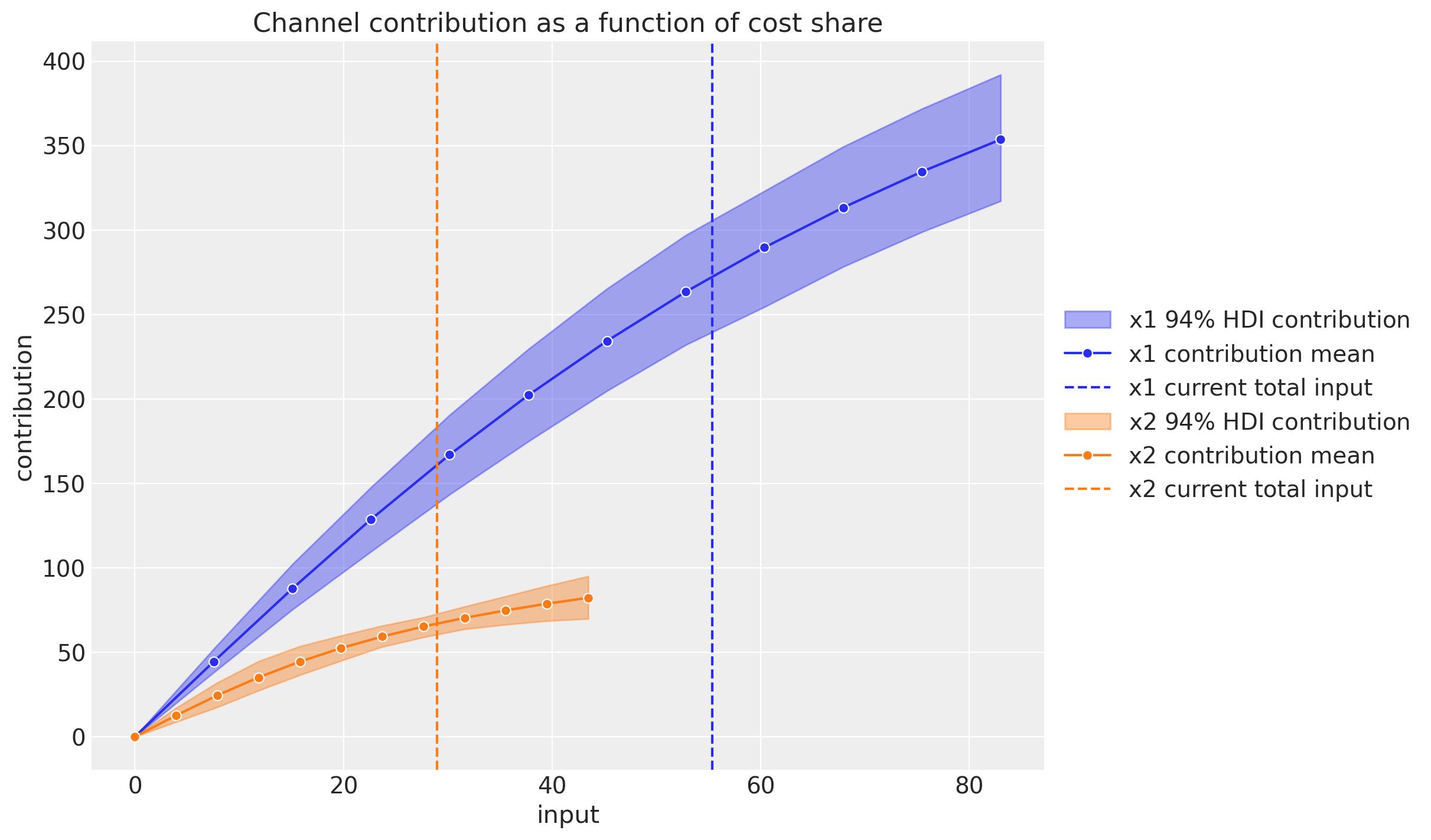 Finally we can use the model to understand the expected sales for different media spend scenarios considering the adstock and saturation effects learned from the data.