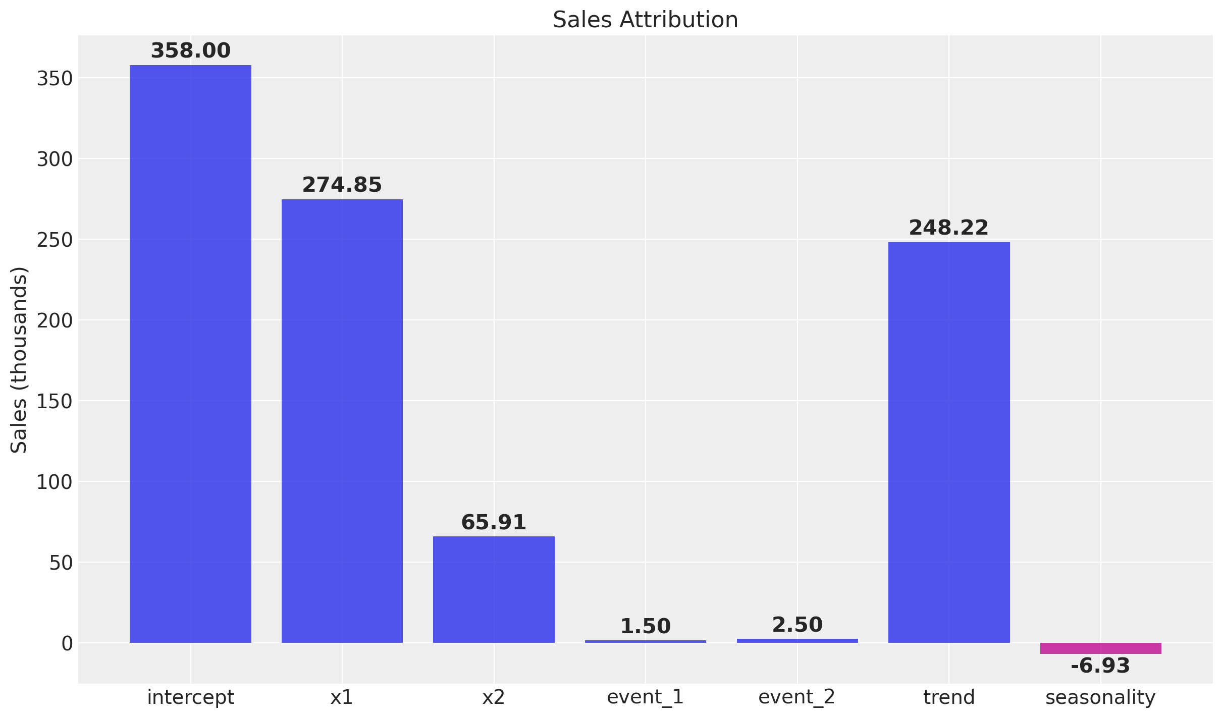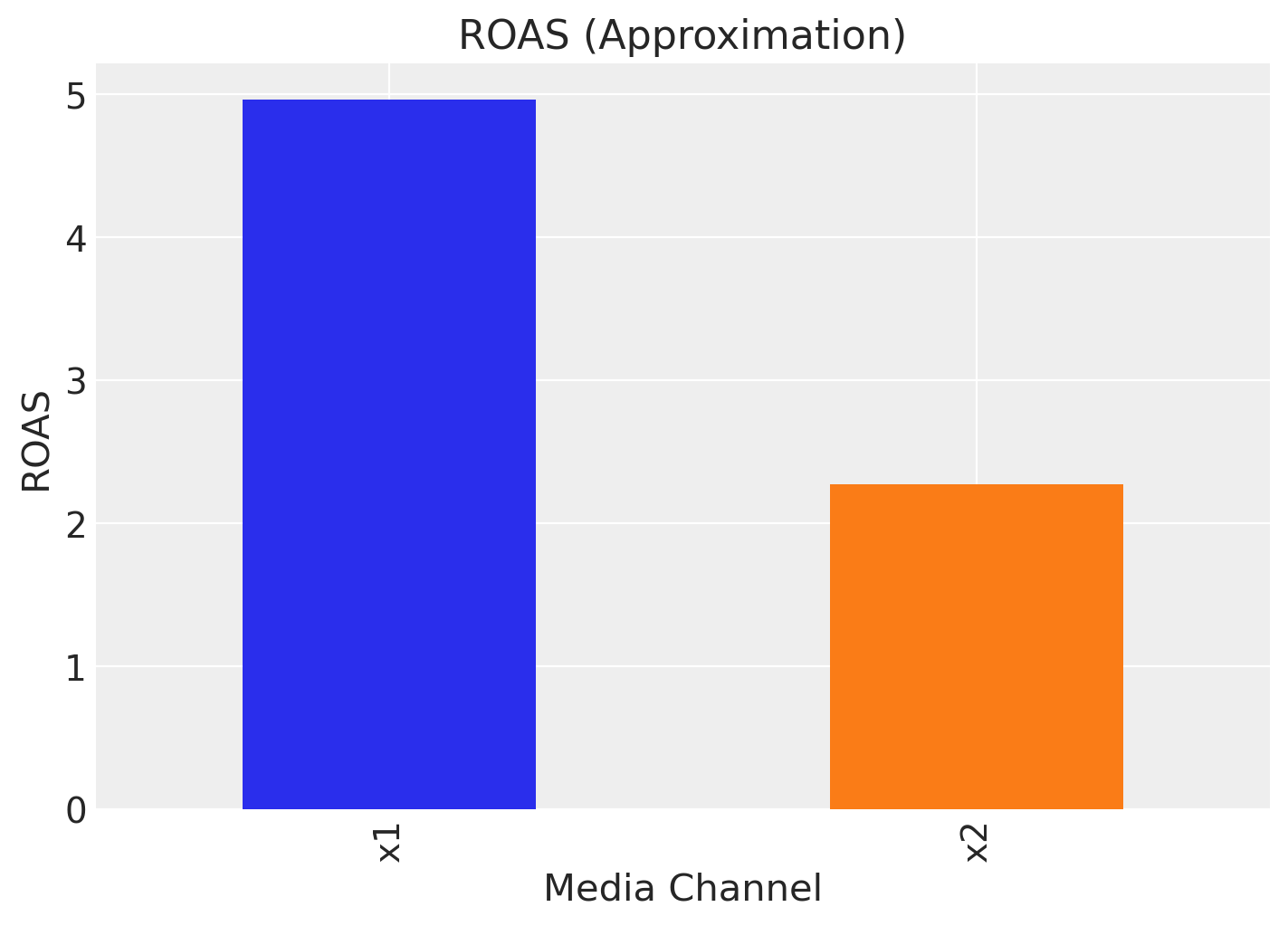 Remark: By design, \(x_{1}\) should resemble a typical paid social channel and \(x_{2}\) a offline (e.g. TV) spend time series.