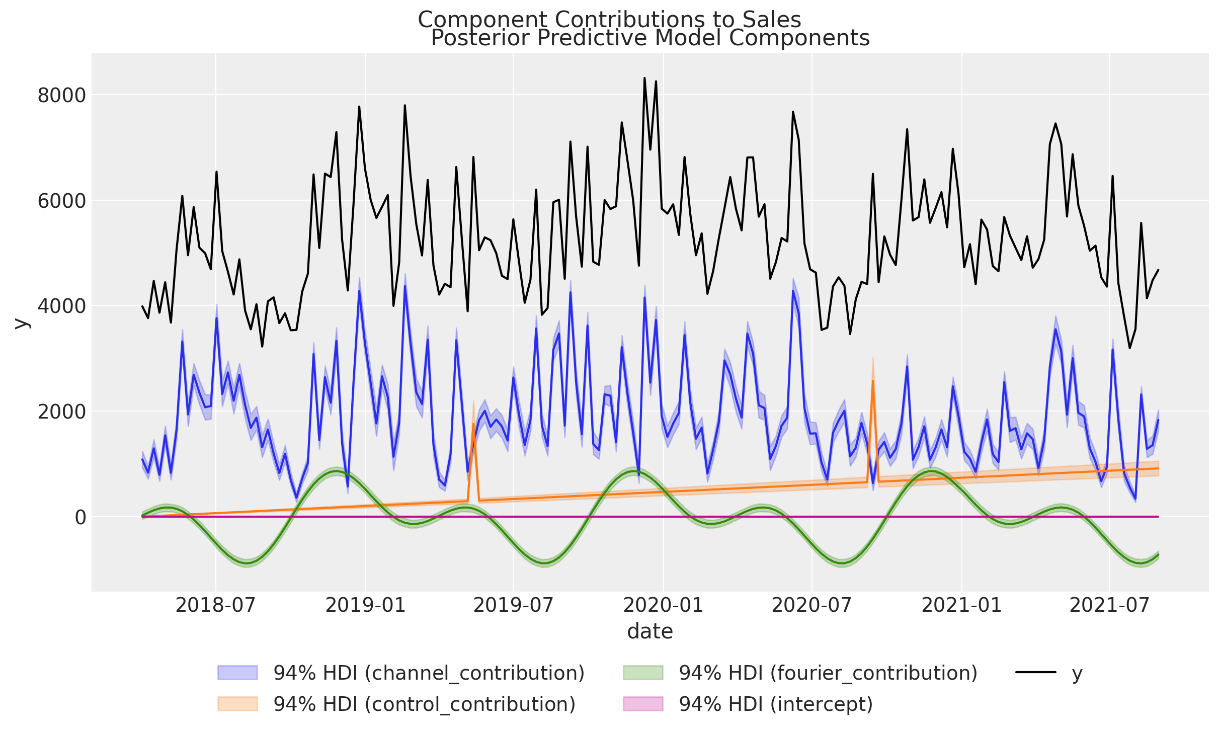 For an extended version of this example, see MMM Example Notebook. Here we delve deeper into the data generating process and model diagnostics. We also include ROAS estimation and out of sample predictions.