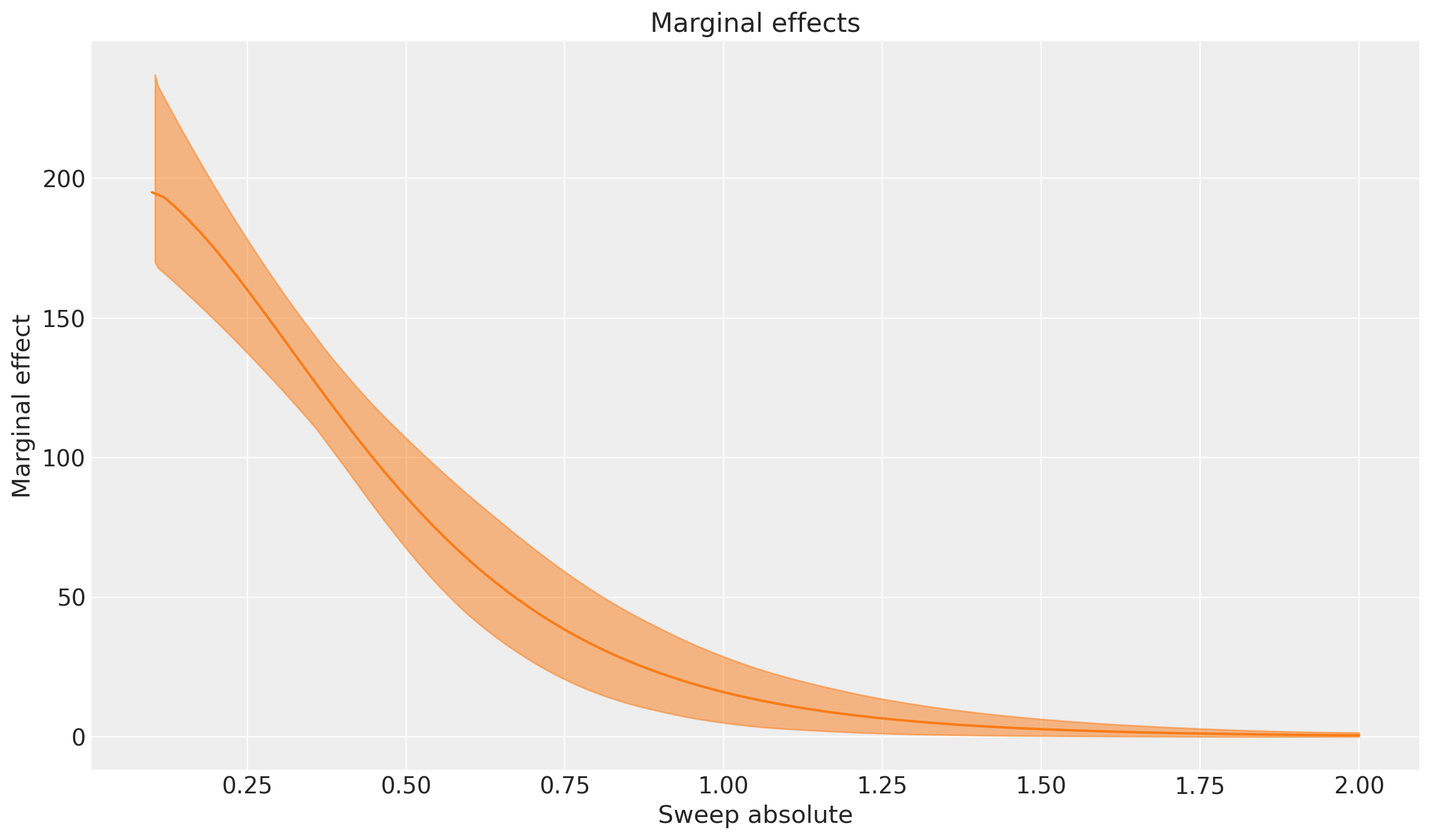 We can see that the highest marginal effects occur on the left side of the plot where we the influence spend is zero or very low. The highest incremental/marginal effects are obtained when we go from no spend to some spend. As we would expect from the previous plot, we still get incremental returns at the current spend levels (multiplicative change of 1.0), and are quite far away from totally saturating this channel - the marginal spend doesn’t reduce to near zero even if we consider a 2x increase in spend.