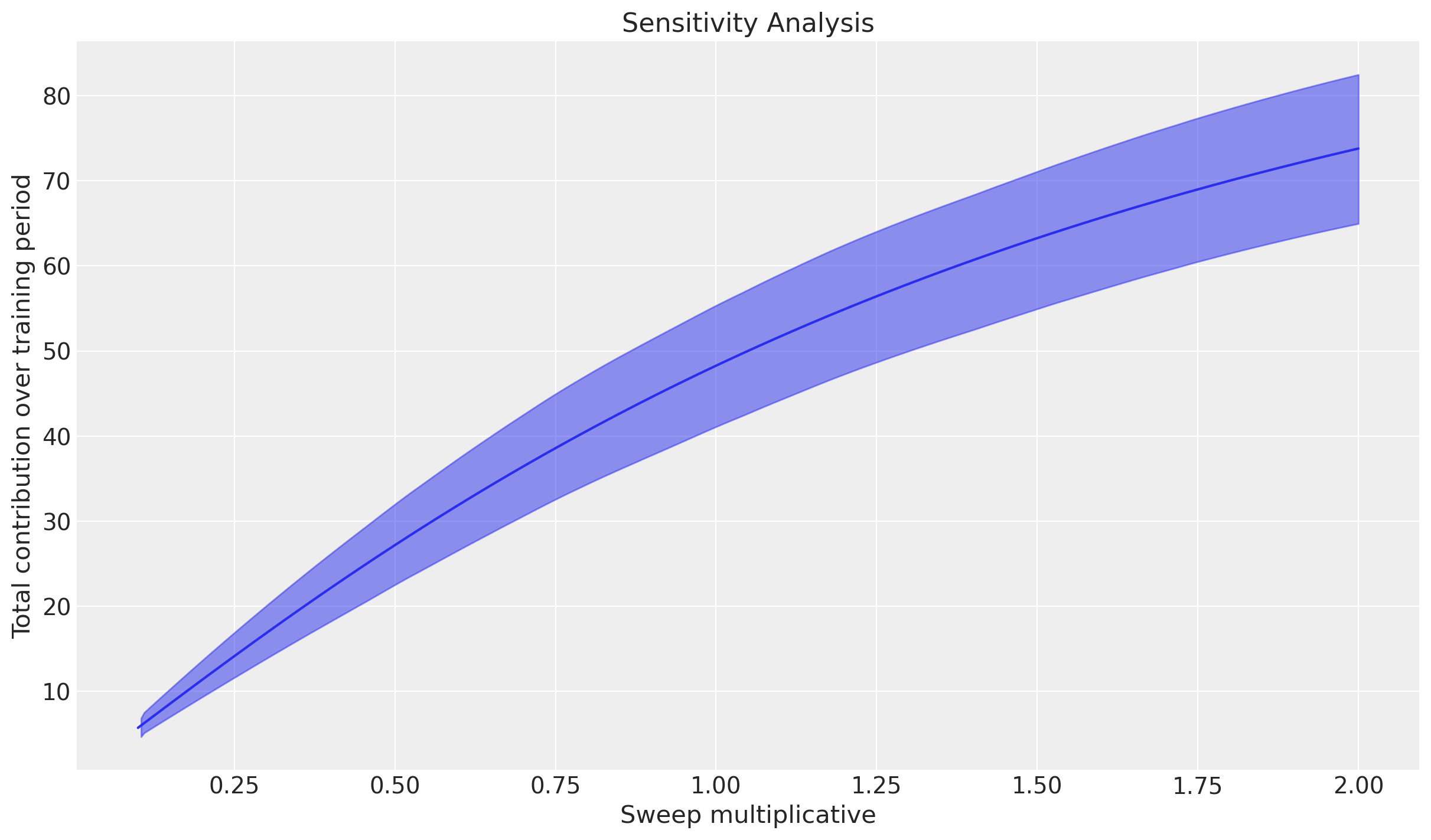 Rather than just considering a single peterbation (e.g., “what if we had spent 10% less on a given media channel”), sensitivity analysis allows us to explore a range of scenarios. So instead we could evaluate our predictions given a sweep of possible peterbations. For example, “what if we had spent [0.5, 0.75, 1.0, 1.25, 2.0] times as much on a given media channel?”