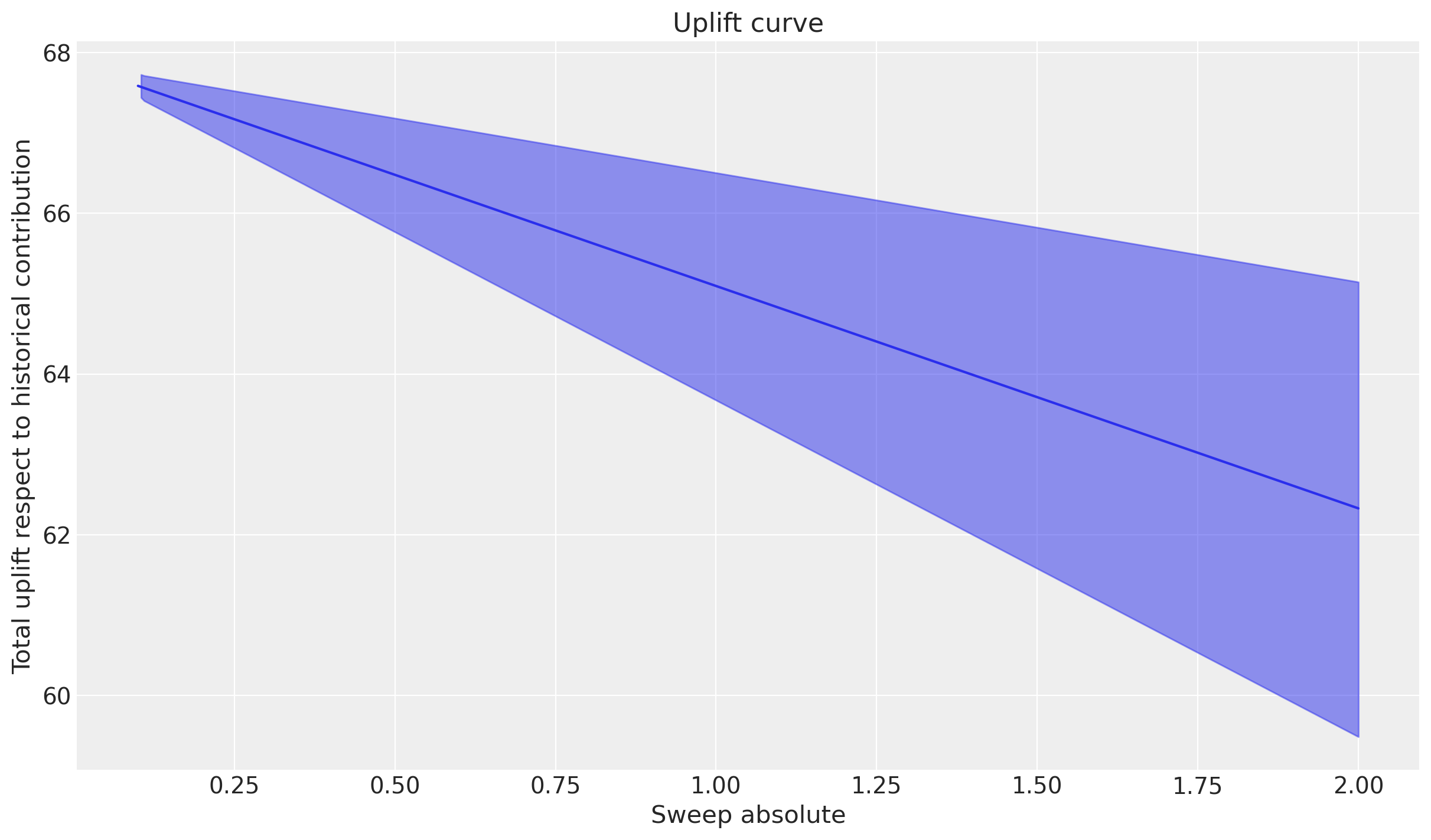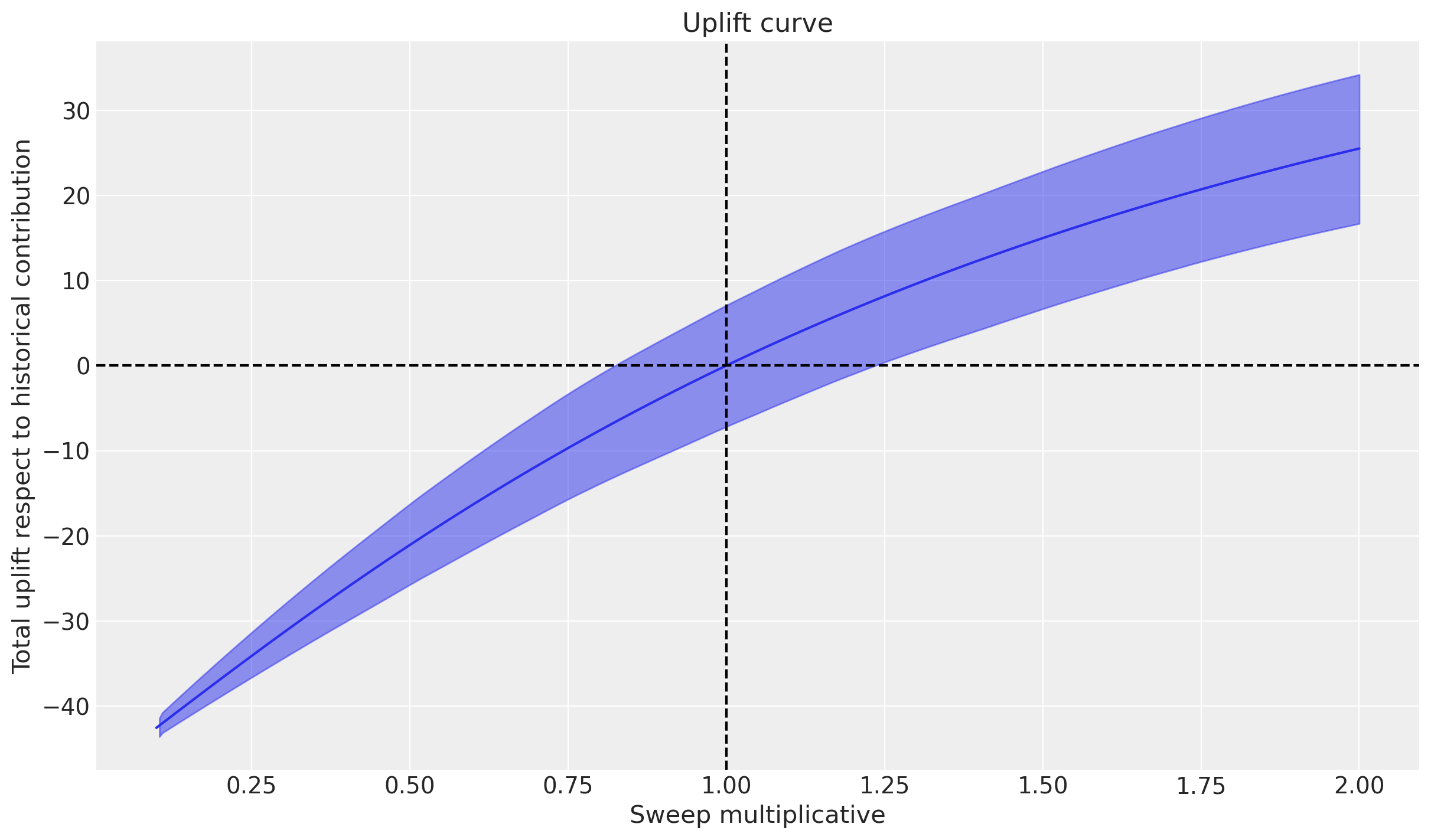 The figure above shows the total expected uplift (it can be positive or negative) for the outcome variable as a function of the sweep values provided. In this case, we used a multiplicative sweep, so the curve is showing how the total outcome would vary if we multiply up (sweep values > 1) or down (sweep values < 1) the influencer spend by the set of values we asked for.