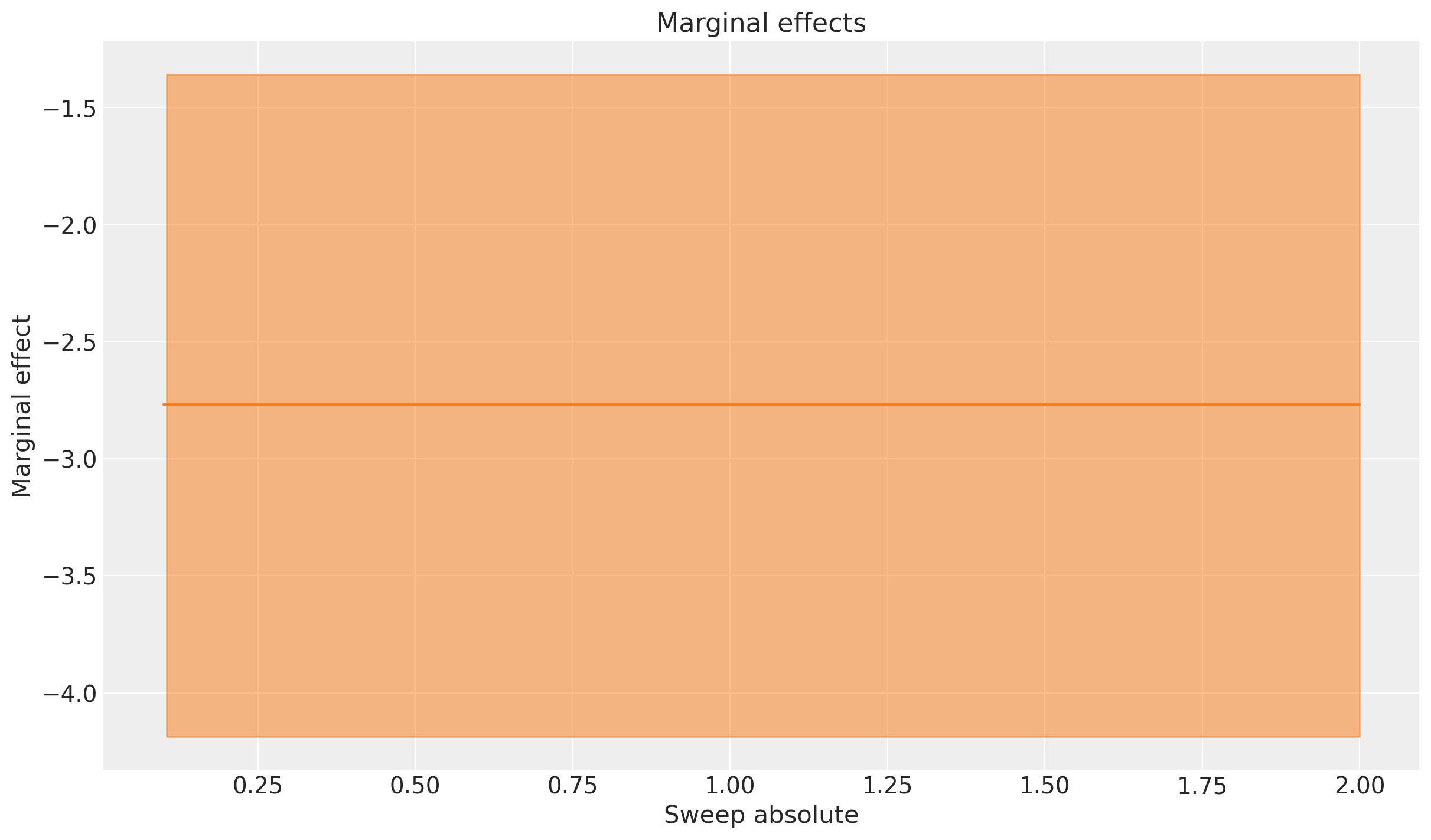 This plot shows the instantaneous rate of change in the outcome variable as we adjust the influencer spend. The y-axis represents the marginal effect, which tells us how much additional sales we expect for a small increase in influencer spend at each point along the sweep values.