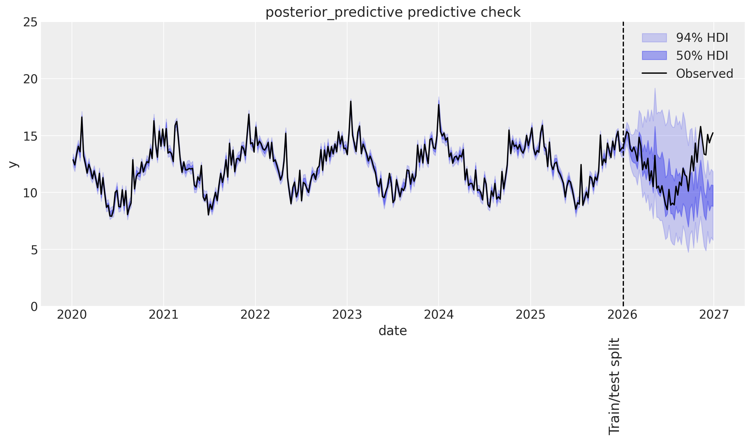 💡 Let’s try to refit the model with a shorter length scale prior mean of one year (52.18 weeks).